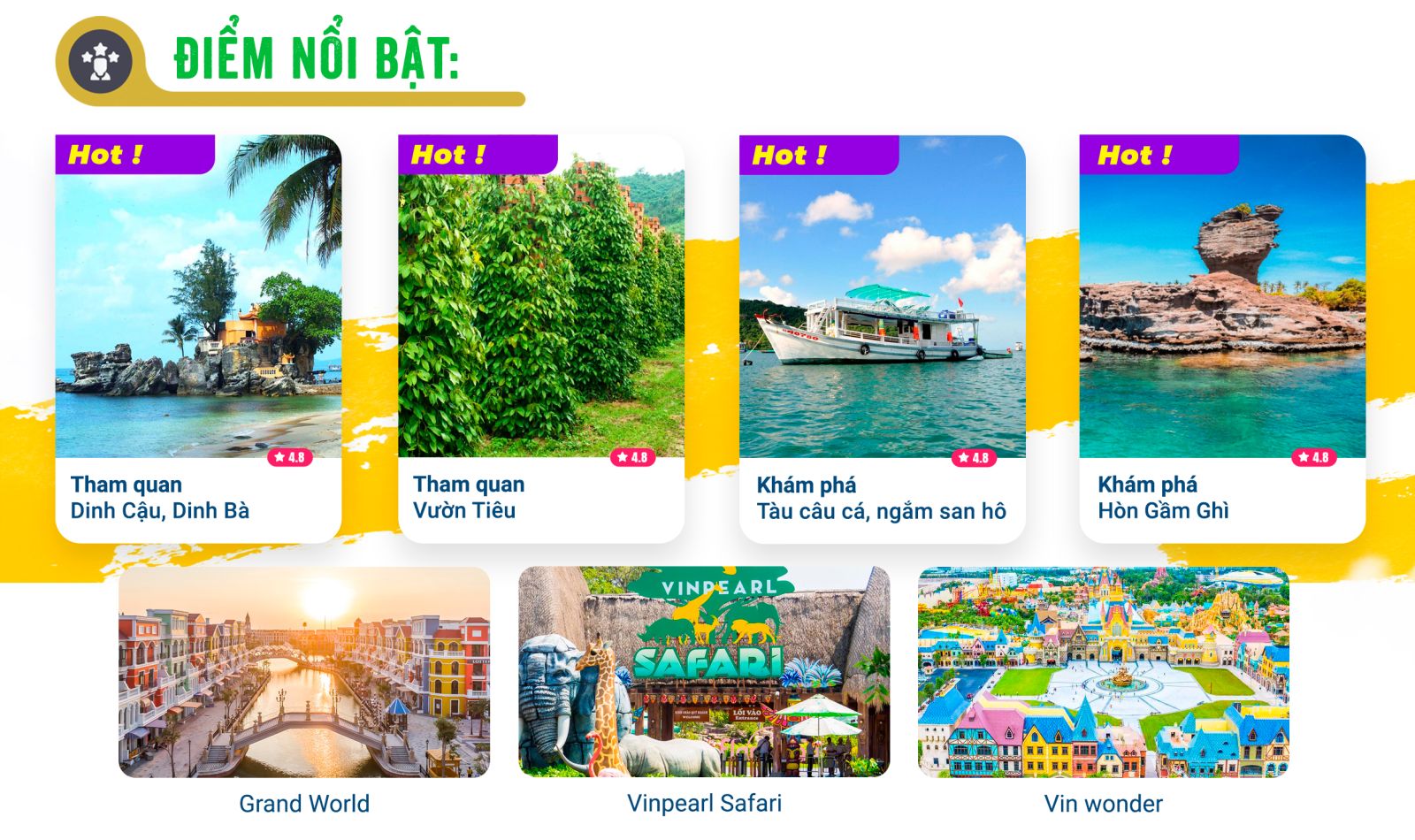 - Xe và hướng dẫn viên đưa đoàn đến Thị trấn Hoàng Hôn, chụp hình check in với các công trình tại Sunset Town, sau đó lên cabin và trải nghiệm cáp treo Hòn Thơm – cáp treo 3 dây vượt biển dài nhất thế giới, đến Hòn Thơm tham gia các trò chơi: Công viên nước Aquatopia – công viên nước lớn và hiện đại bậc nhất Đông Nam Á, các trò chơi cảm giác mạnh: Mộc xà thịnh nộ - tàu lượn siêu tốc bằng gỗ đầu tiên và duy nhất tại Việt Nam, hoặc Mắt Đại Bàng – đài quan sát 360 độ tại làng Exotica với độ cao ấn tượng 120m.